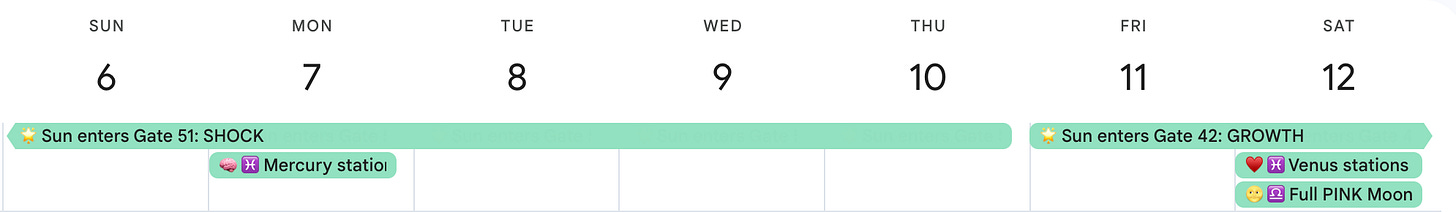 This week carries the energy of transition. Mercury and Venus are shifting forward, but not yet at full speed. The Human Design gates guide us through shock and into growth. The full moon in Libra asks us to find balance between the past and the future.