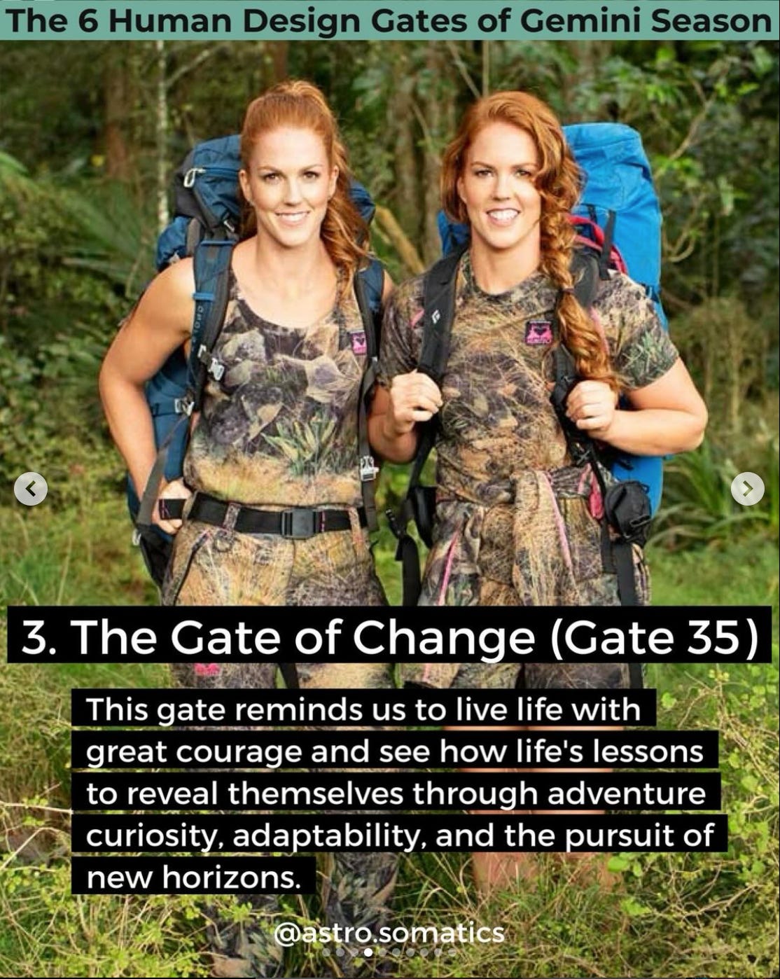 This week, I invite you to lean into contemplations on what change means to you, and what gathering together means to you. You can pull your human design chart here to see if gate 35 or gate 45 are activated for you, meaning that you had planets in this part of the sky when you were born.
