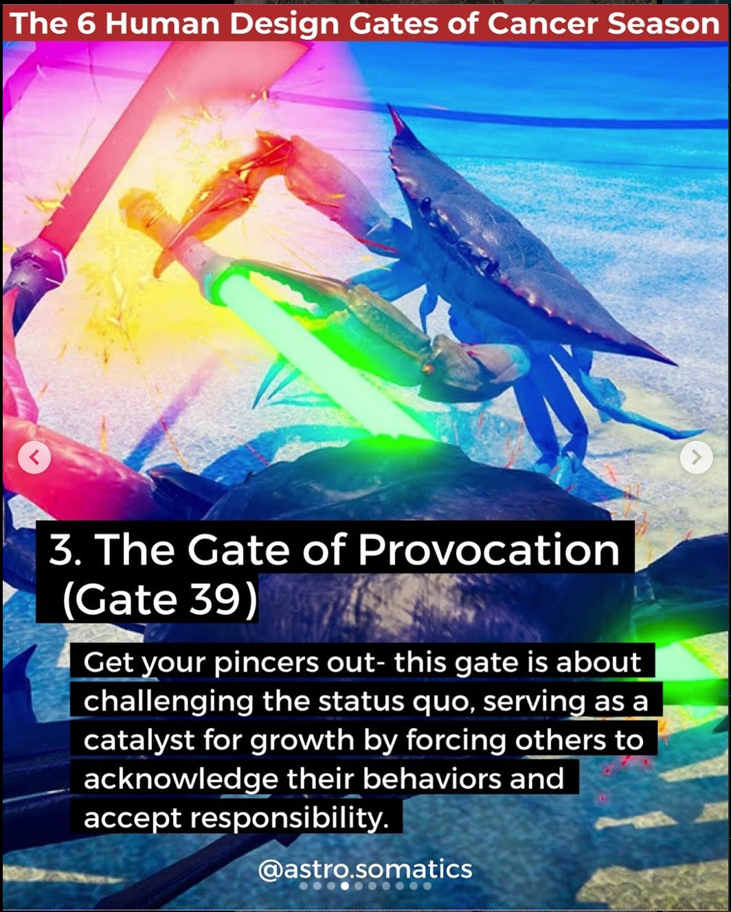 As we deepen into Cancer season, we enter the Gate of Provocation, known as “Obstruction” or “Temporary Obstacles” in the I’Ching. Fitting for the season of the crab, Gate 39 is a feeling and emotional gate, focusing on themes of challenge, provocation, and evolution through triggering emotional responses in others. After a week of stillness, restraint, and the stress that may have come with it, the energy this week is a reaction or a response to how that energy felt for us.