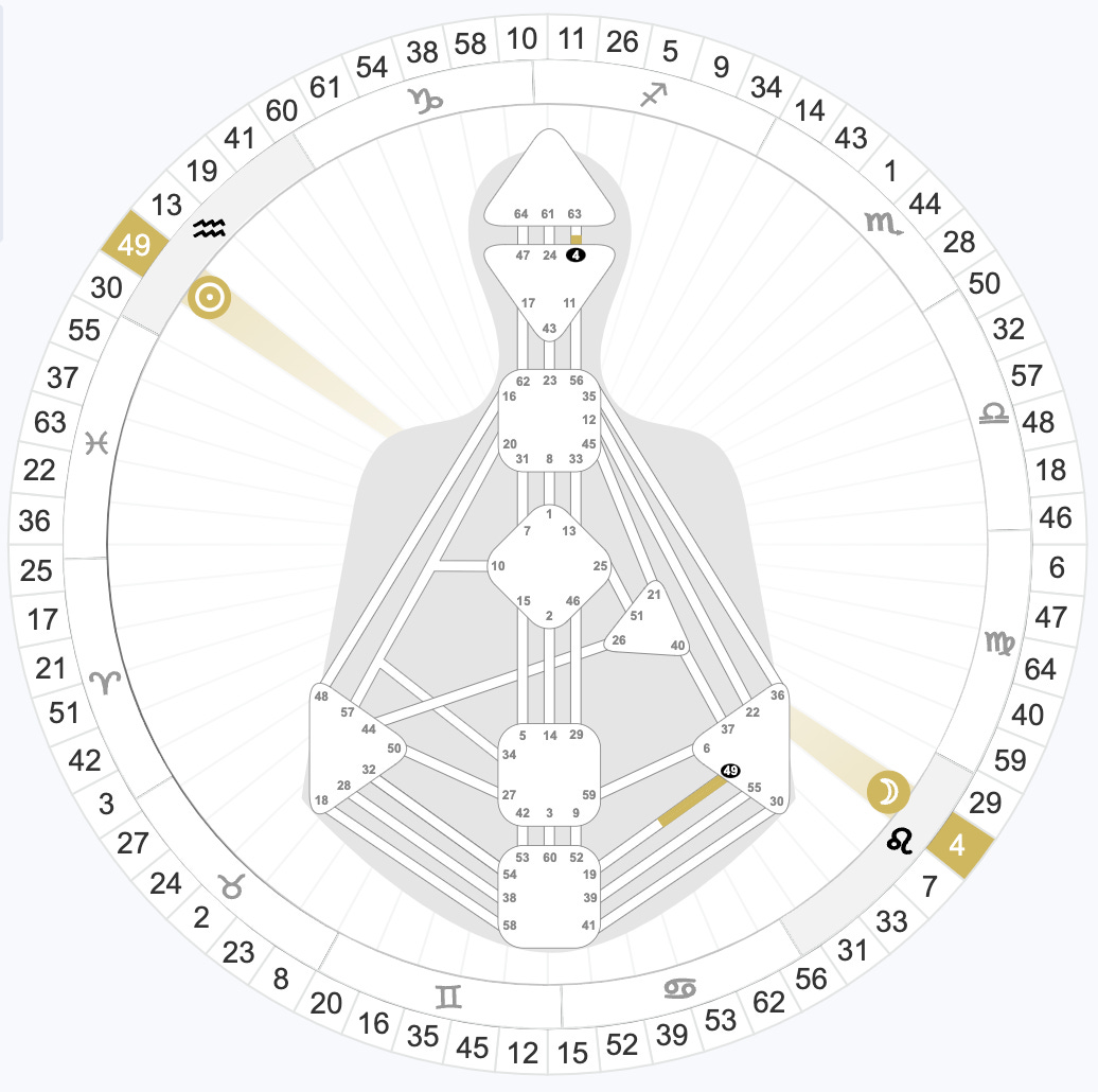 Unbalanced Expression: Getting stuck in overanalyzing revolution (Moon in Gate 4) instead of feeling when change is necessary (Sun in Gate 49).