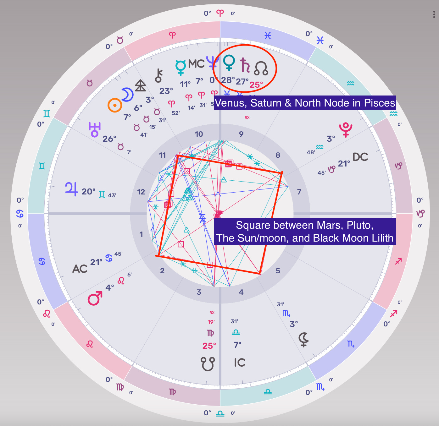 I write to you from the depths of some powerful astrology. The angles in the skies were exact last week, but their strong influences will continue through the week ahead: the Mars-Pluto-Lilith-Sun T-Square, a bright red cross in the chart of the moment connecting the fixed signs and revealing their tensions and breakthrough-points, and the triple conjunction of Venus, Saturn, and the North Node in Pisces, showing us that love and harmony aren’t possible without a little elbow grease.