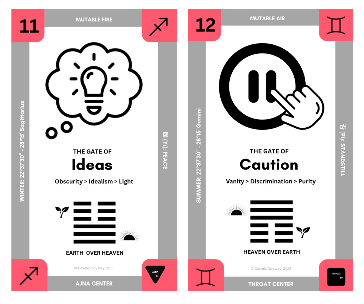 This polarity teaches that ideas only become wisdom when passed through the filter of integrity. Too much Gate 11 and you scatter your energy in every direction. Too much Gate 12 and nothing escapes your throat at all.