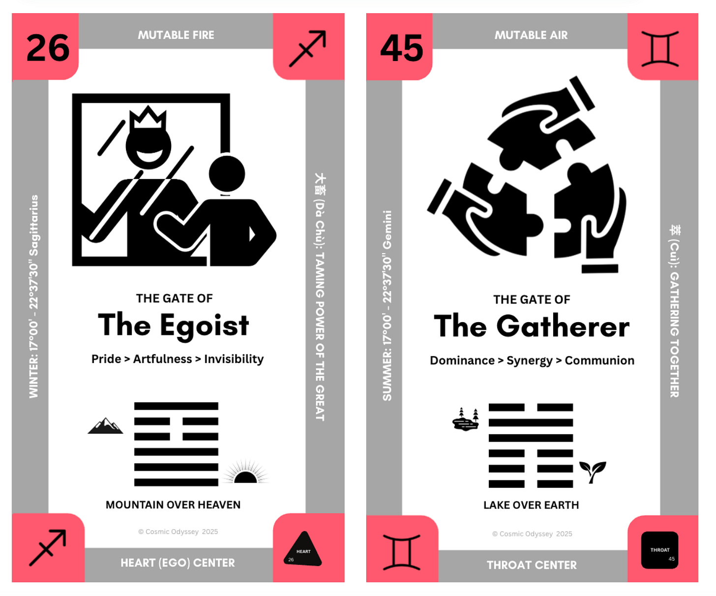 Gate 26, “The Egoist,” is the refined intelligence of the Heart center, where ego isn’t a blunt instrument but a tool of precision. In the I’Ching this is the Taming Power of the Great, a hexagram that speaks to restraint, strategy, and the skill of choosing the right moment. The Taming Power of the Small is the I’Ching’s name for the Gate of Focus, Gate 9 another Sagittarius season gate that we just went through. Both happening during the fiery late- fall season remind us that discipline comes in two forms: the precision to shape the moment and the restraint to tend the tiny detail that keeps the whole vision from burning too fast.