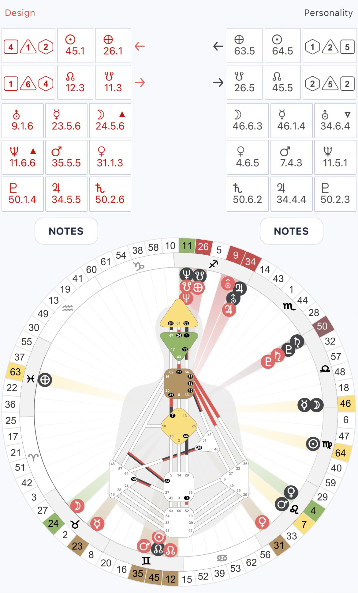 As you can see, I have Gate 7 and Gate 4 activated (in black) -those are the parts of the Leo sign in the sky that Mars and Venus were in when I was born. I also have Gate 31 activated (in red), which indicates where Venus was when I was in Utero, 88 days before birth at the start of my mother’s third trimester. These “design” gates affect us in more subconscious ways.
