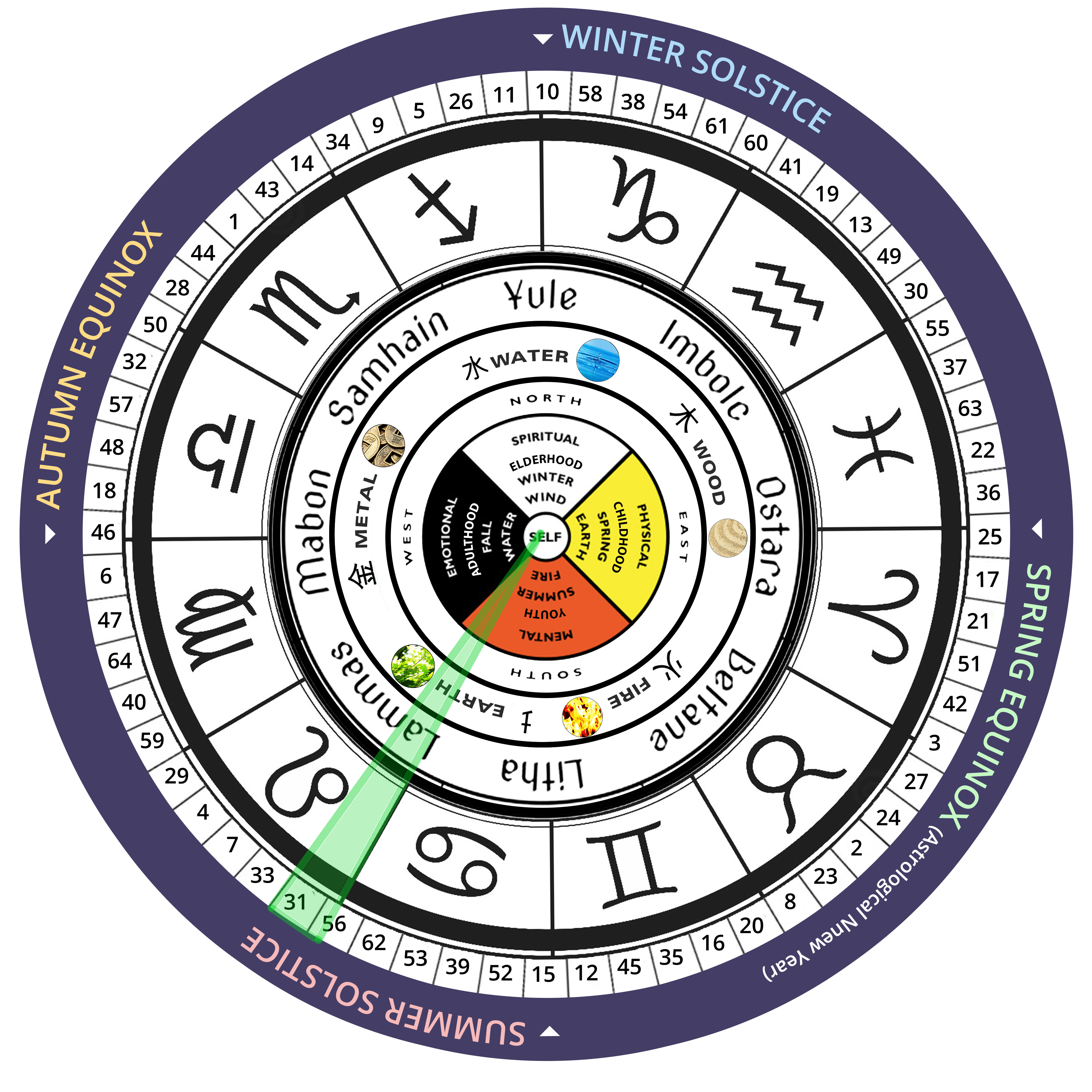 The rising sign, or ascendant, isn’t typically included in Human Design Charts, but I like to include it in my Cycles of Time readings. My ascendant is at 6 degrees Leo, so it is also in Gate 31. Needless to say, I’m pretty Leo-heavy, so I’ll be curious to note how these energies show up in my life this season.