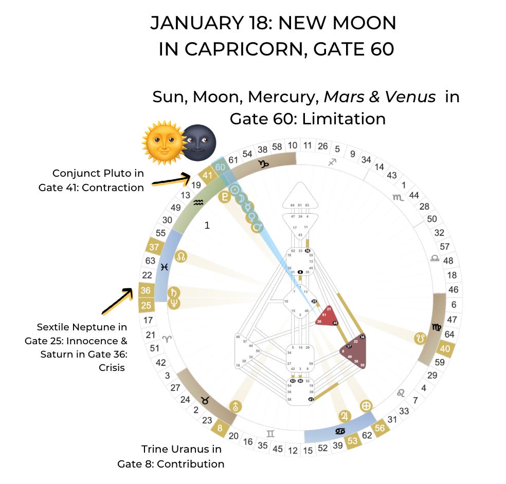 The New Moon at 28° Capricorn lands in Human Design Gate 60, known as the Gate of Acceptance or The Gate of Limitation. This gate, based on the names, evokes a notion that we must accept our current limitations before we can begin anew. Gate 60 sits right at the end of a developmental hallway. Gate 60 spans late Capricorn into the first degrees of Aquarius, which makes it a threshold gate by nature, the kind of place where you gather yourself, pack lighter, and decide what you are actually bringing forward, because the next room is not going to tolerate the same clutter.