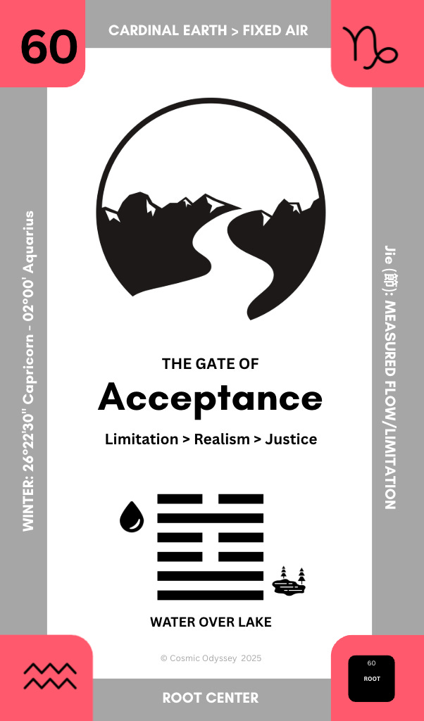 Gate 60 can get a bad reputation because the word limitation brings up old conditioning, authority issues, deprivation stories, the sense of being boxed in. That’s the shadow version, and it’s real. The deeper truth is that limitation is how form exists at all. Without a rim, a bowl cannot hold water. Without banks, a river becomes a swamp. Without the joints, bamboo collapses. Limitation is the sacred technology that makes something usable, and Capricorn understands sacred technology better than almost any other sign because Capricorn measures time, effort, consequence, and integrity.