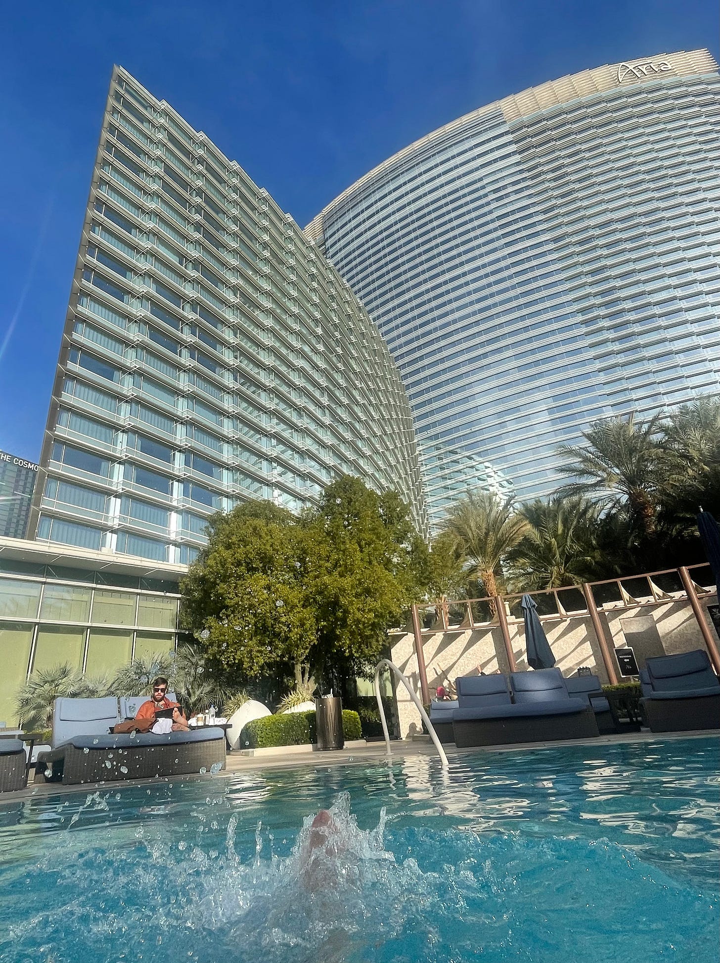 I write to you soaking wet, sitting poolside at the Aria hotel in Las Vegas. As I just floated on my back in the silky, turquoise oasis on this Cancer full moon, I gazed upward, past a cluster of structured palms, to a monolith of metal and glass cutting through the winter sky intersected by multiple jetstreams. The structures, symbols of the achievements and successes of so many human’s ideas, struck me as so Capricorn.