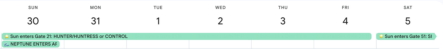 This week marks a powerful threshold. We’re stepping out of the dreamy, passive waters of Neptune in Pisces and into the bold fire of Neptune in Aries. Meanwhile, the Sun in Gate 21 reminds us that true power is about self-mastery, not external control.