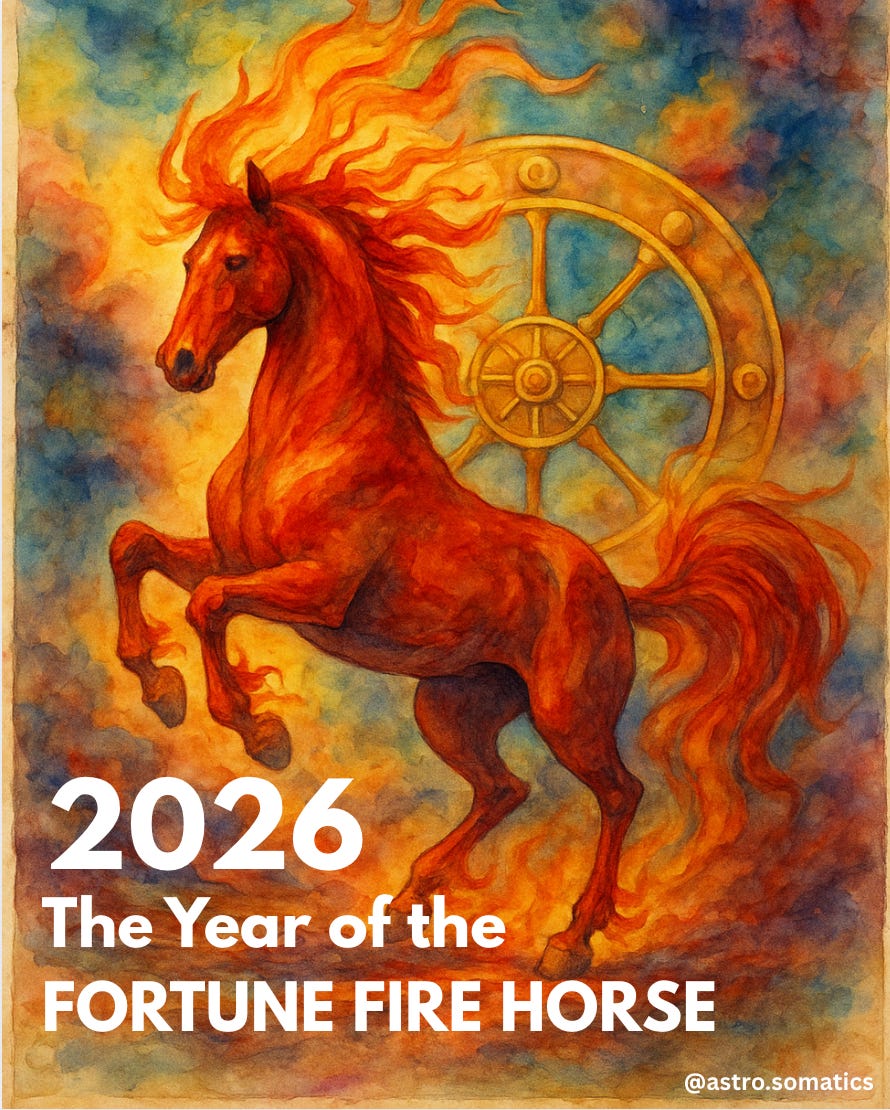 As we make our way through Sagittarius season, my mind is struck by the parallels between the Wheel of Fortune Fire Horse and the mutable fire sign of the Centaur Archer. As I feel into the energy of the season, I have a felt sense that next year’s Fire Horse Wheel of Fortune energy will move with the same wild velocity as Sagittarius, both galloping toward destiny with untamed fire, instinctive risk, and a trust that the horizon always holds the next lucky turn.