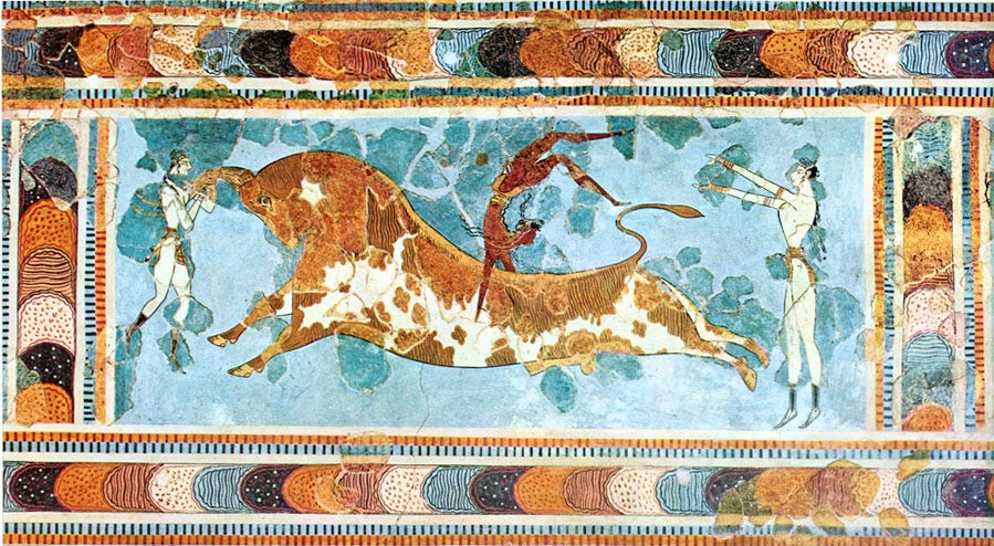 Taurus the bull has been important to humans since early times- the Taurus constellation rose with the sun during the spring equinox from 4300 to 1580 BC, which was also the time of a significant rise of agriculture, aided by the power of the bull. The earliest known cave art in Lascaux, France, contains bulls painted 17,000 years ago. Ancient Sumerian Venus goddess Innana - goddess of fertility, sex, and war - was often represented with a bull. Minoan civilization in Crete, which emphasized the mother-goddess, revered the bull and even had a sport of acrobatic bull-leaping by both men and women, visualized on several frescoes like this one: