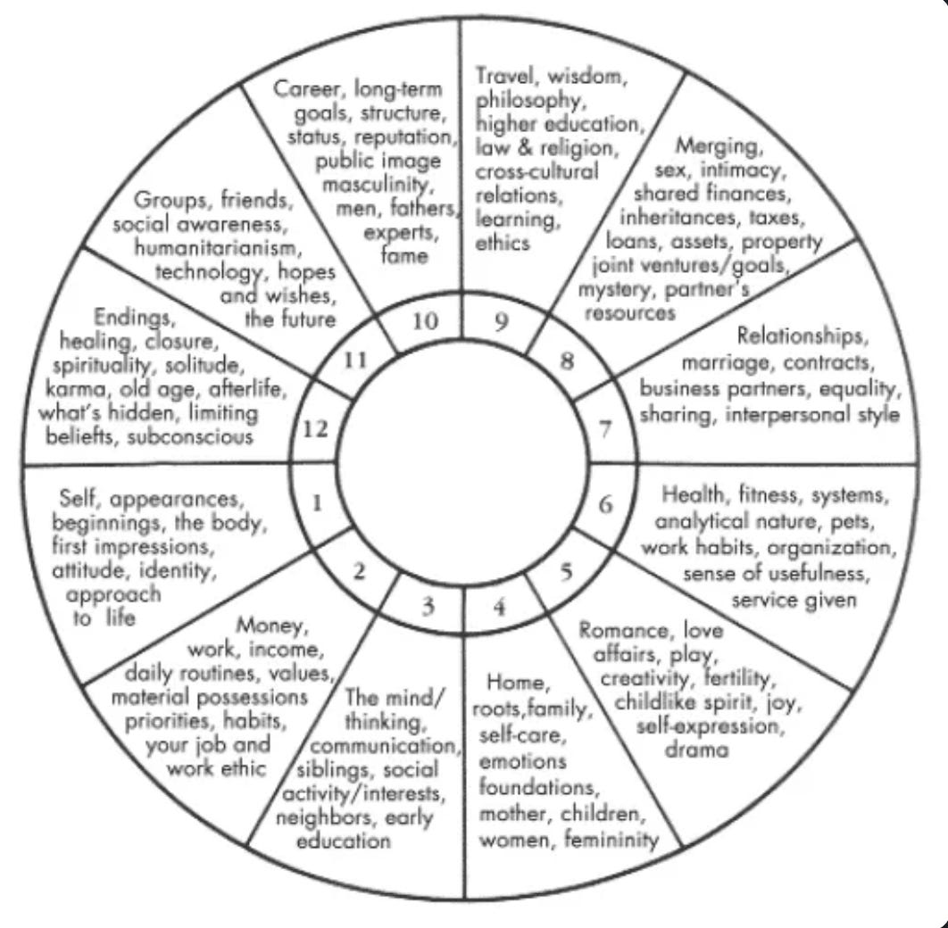 Second, think about the houses where Taurus and Scorpio are in your birth chart and what they symbolize. (If you don’t know this info, you can pull your birth chart, or if you know your rising sign, you can reference the list and house chart below.)