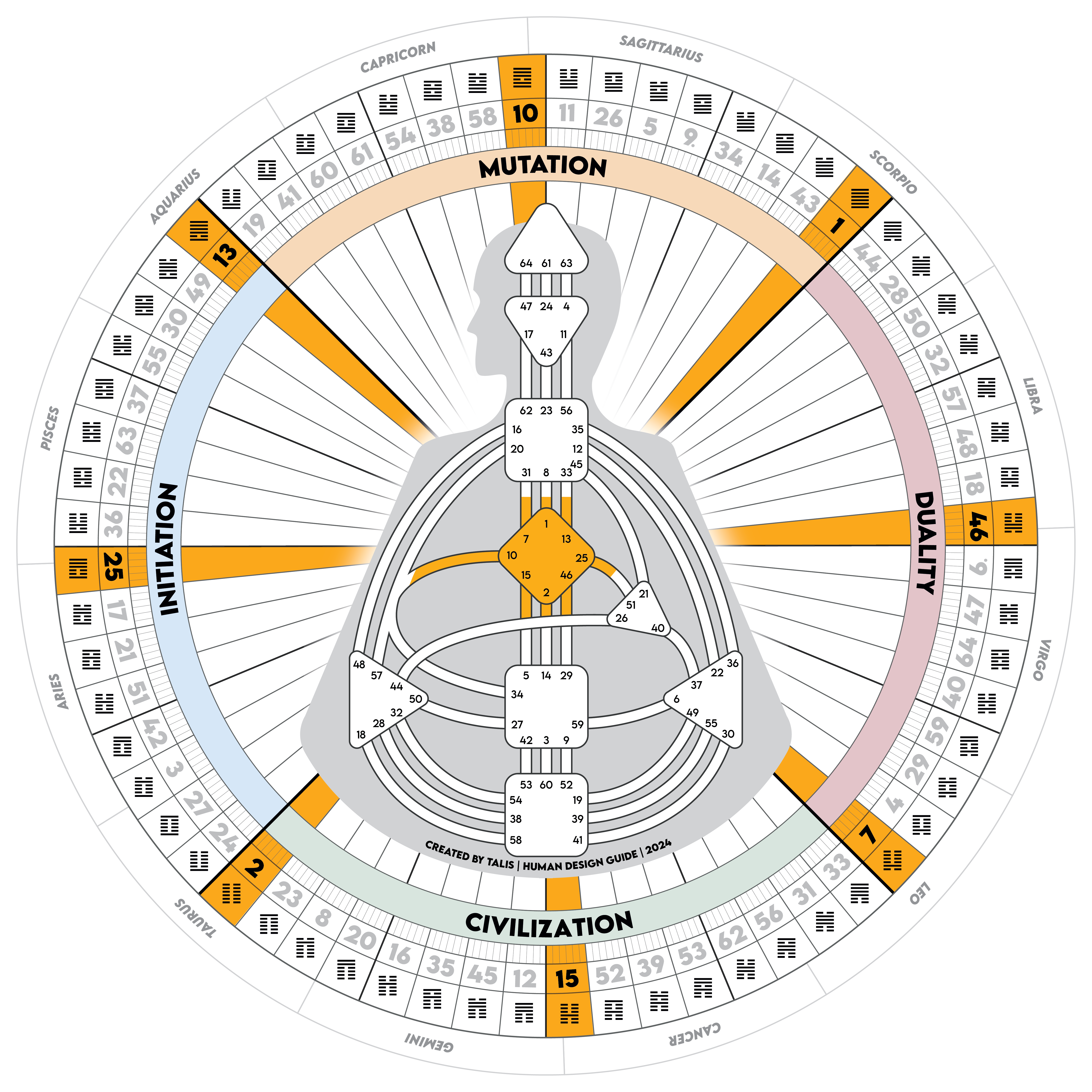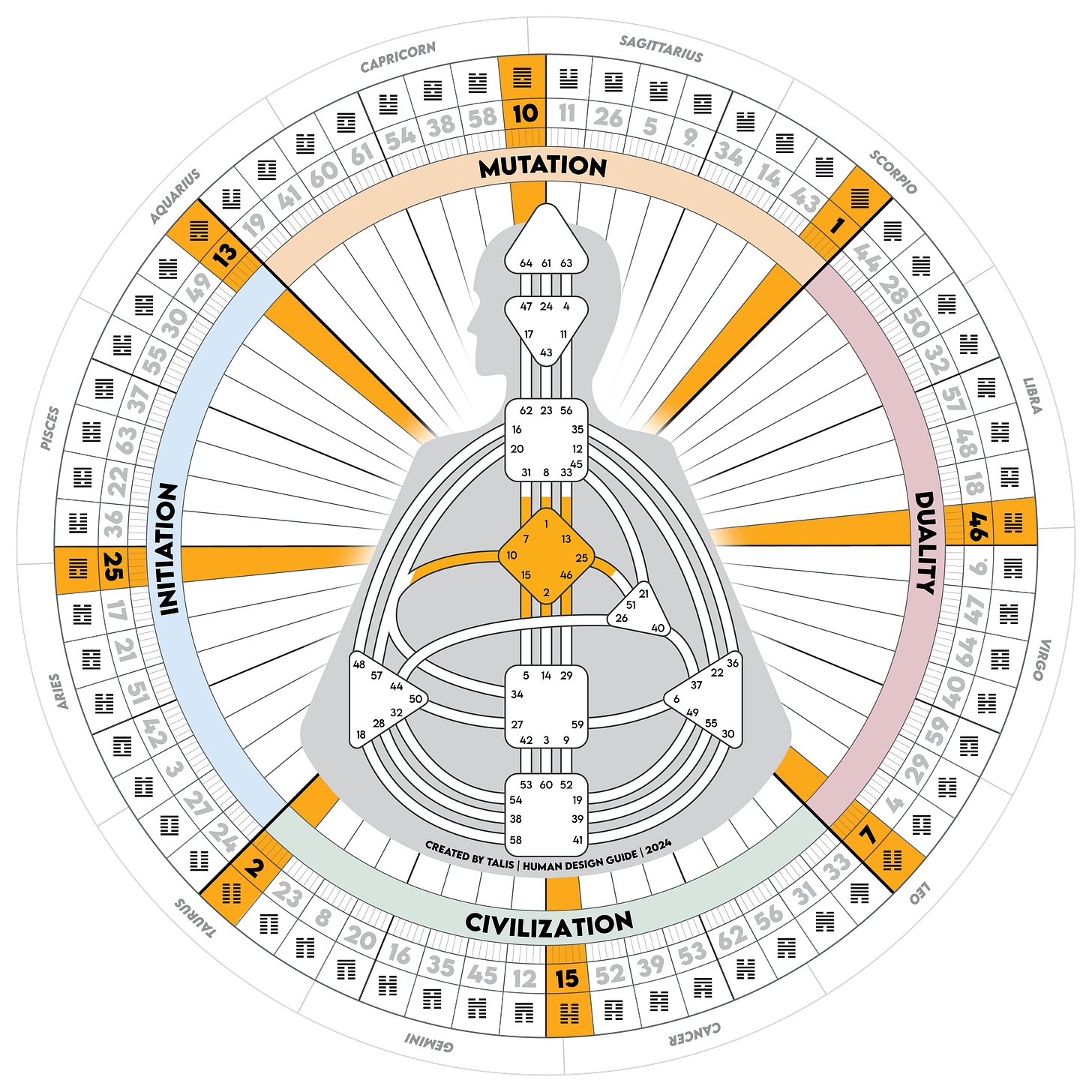 Over the coming year, we’ll be walking the year along with the sun as it passes through the 64 gates of the Human Design Mandala. These gates are arranged around the Zodiac wheel/Wheel of the year according to the Fuxi sequence of the I’Ching. Thisis an ancient ordering of the 64 hexagrams attributed to Fu Xi, the mythic first emperor of China and one of the founding figures of Chinese cosmology.