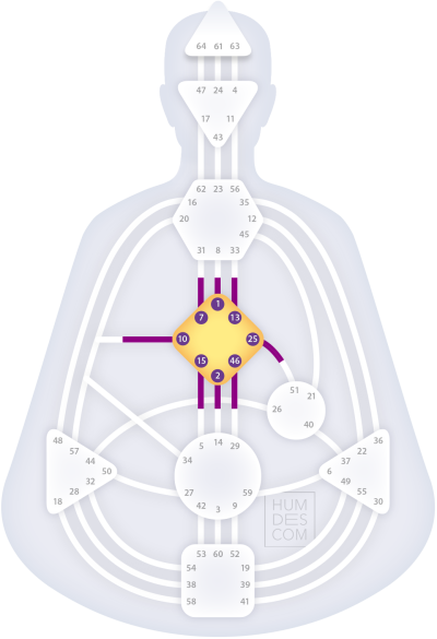 Polarity: The complimentary gate to Gate 25 is Gate 46, known as the Love of the Body. Where Gate 25 loves without agenda, Gate 46 loves being embodied, in this life, in physical form. Together they hold the polar tension of both spirit meeting matter and the soul feeling at home in its vessel.