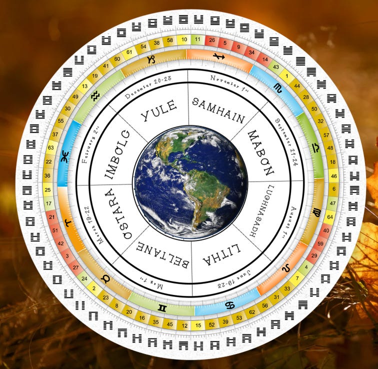 And then there are the eight gates of the G. The G center is the only center in the bodygraph that touches all four quarters of the zodiac wheel, and its eight gates correspond precisely to the eight holy days of the Celtic and Pagan Wheel of the Year: the solstices, the equinoxes, and the four cross-quarter days that fall between them, Imbolc, Beltane, Lammas, and Samhain.