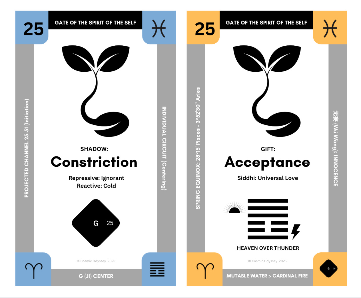 In the Gene Keys. the shadow of 25 is constriction, the armor and tension we have in our bodies after too many losses or after a major crisis (like going through the birth canal). The gift is acceptance, full contact with what is, not what we wish it was. And the siddhi, universal love, is what remains after that constriction gradually and finally releases fully.