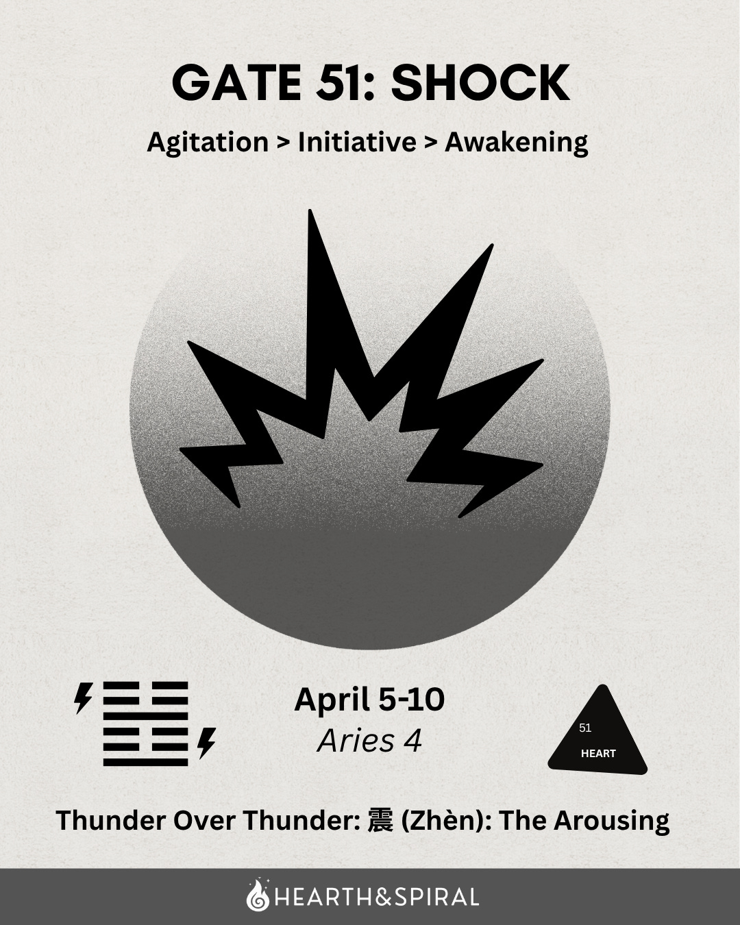 Season: The lower trigram through this stretch of Aries has been Zhèn, Thunder, and Gate 51 doubles it: Thunder over Thunder. This is the most concentrated expression of Thunder season in the whole wheel. Two thunders stacked on eachother feel omnidirectional, arriving from above and below simultaneously. The upper and lower trigrams are identical, which in the I Ching points to an intensification of the initiating, cracking-open quality of this energy. Whatever this gate wakes up in you, it tends to wake it up fully.