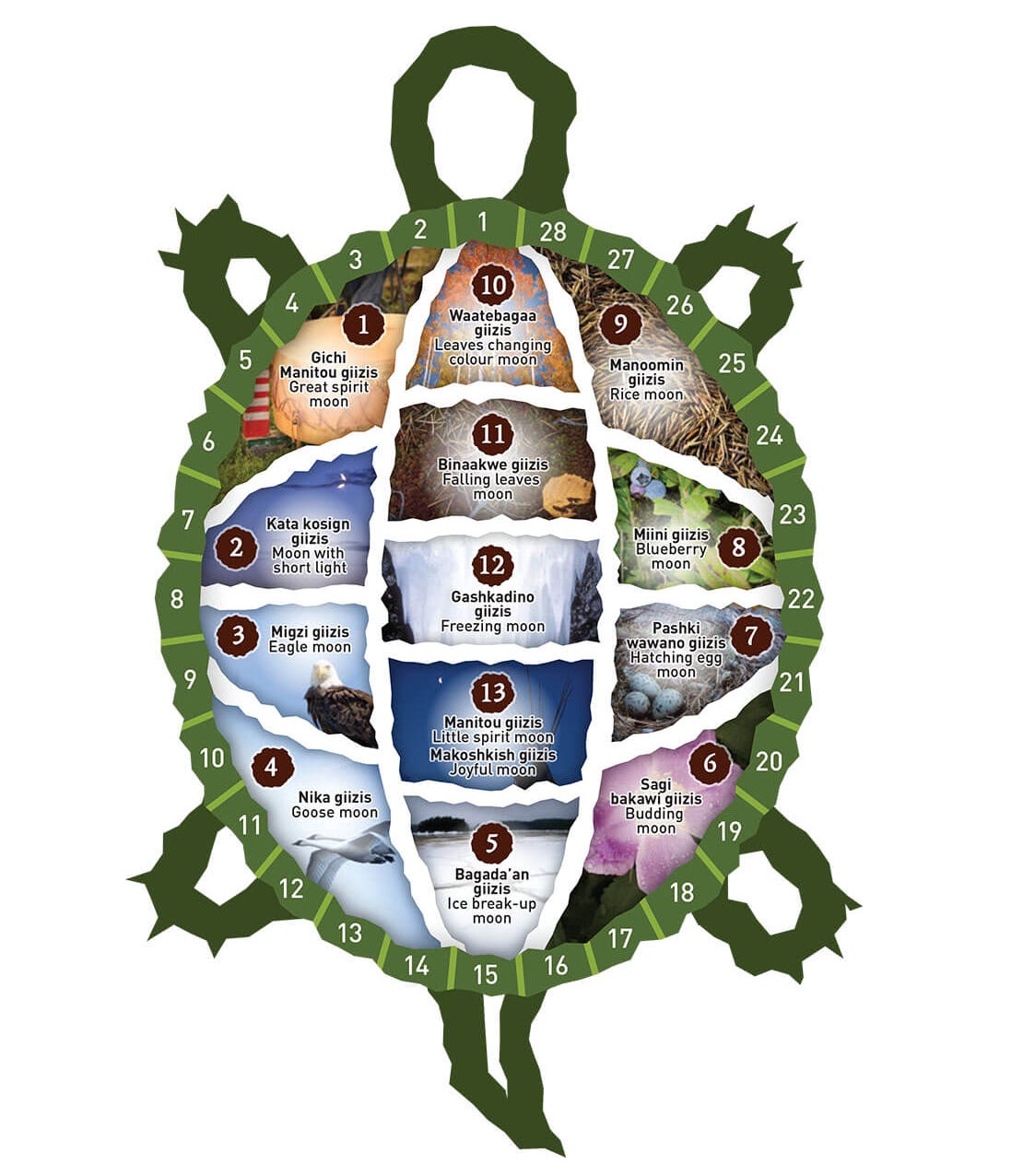 Of course, “Native Americans” are certainly not a monolithic group, and there are almost as many names for the 13 moons of the year as there are tribes, with some regional overlap. Many Indigenous people use the turtle shell as a calendar, with the 13 sections of the shell representing the 13 lunar months, each with 28 days, represented by the outer scales. Each new month begins on the first night of the full moon, and each moon is named to reflect the seasonal influence within its cycle.