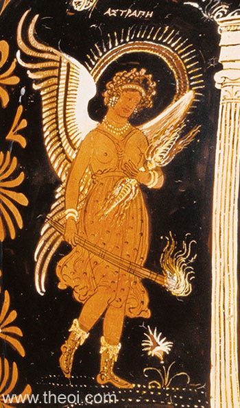 Astraea, the greek Star Maiden, represented all that was good in the world. She was the daughter of the god of dusk and the goddess of dawn, and embodied justice, innocence, purity, and precision. She lived on the earth with humans during the Golden Age, but eventually was sent to the sky by Zeus as the constellation Virgo when she became too overcome with the lawlessness and misery of mankind. Astraea was the last of the Greek immortals to leave Earth, sticking by their side far longer than any of the other immortals. Many believed that her return to earth will usher in a new Golden Age of Man.