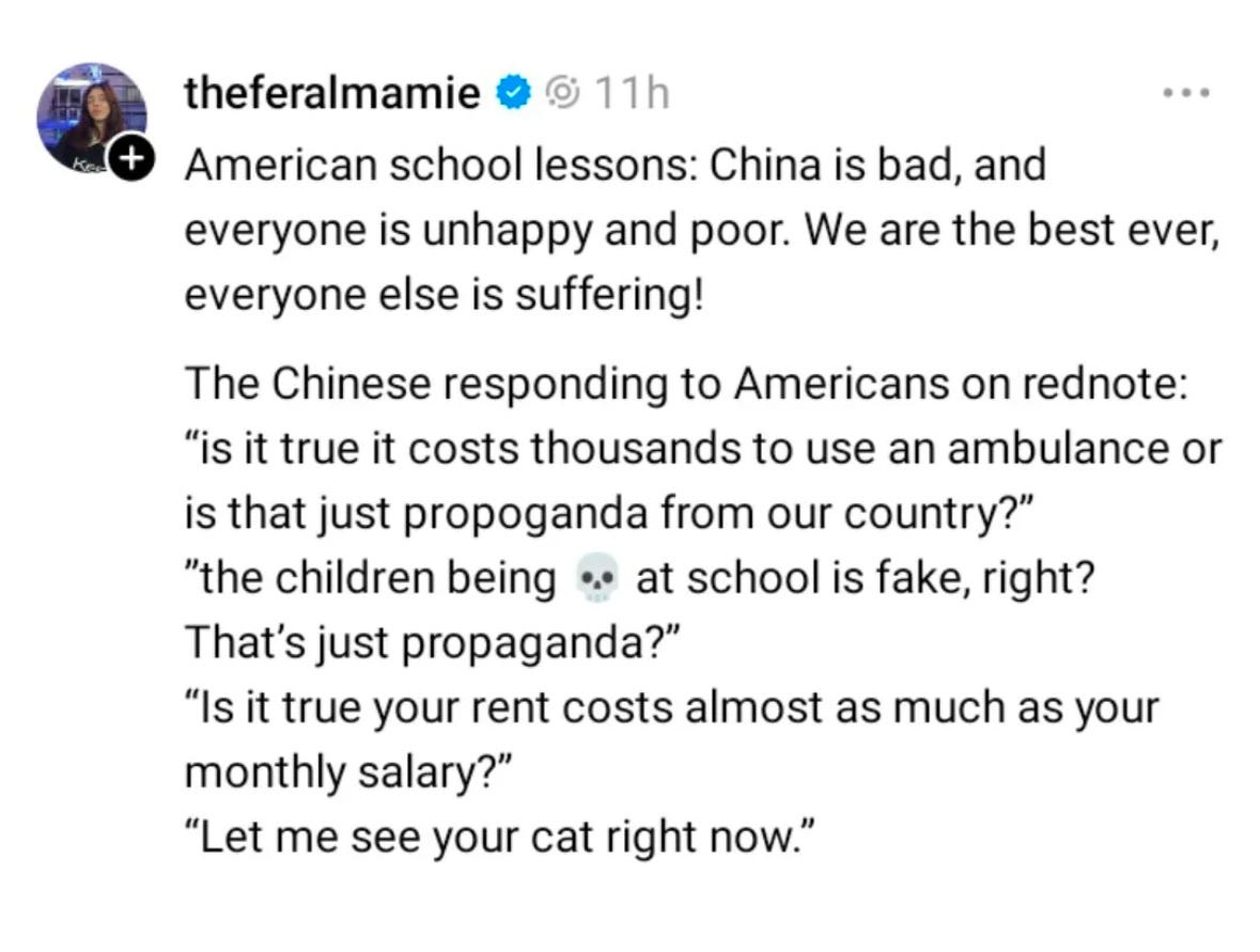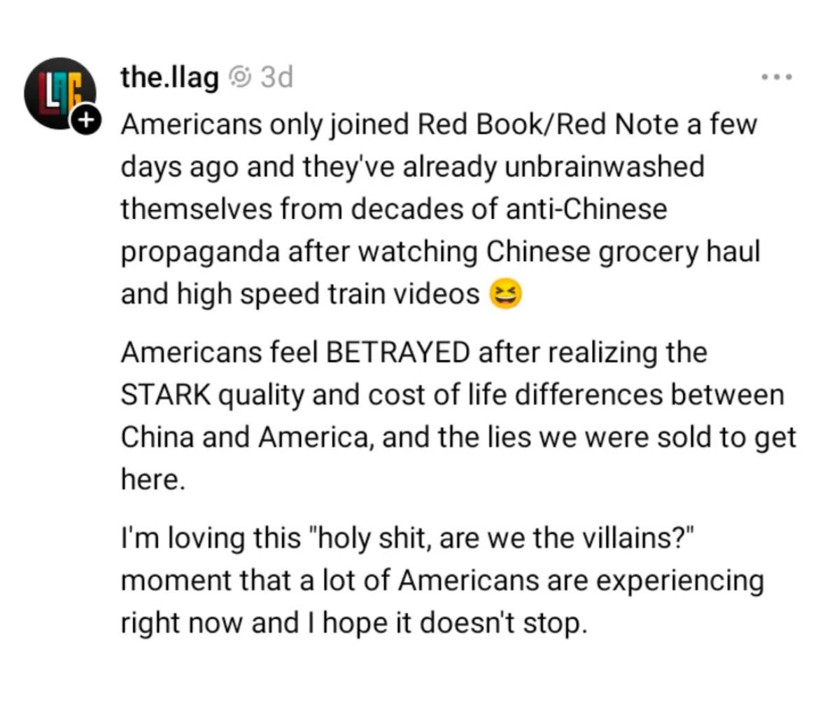 The beautiful irony isn't lost on me - in trying to limit Chinese influence by banning TikTok, we've inadvertently created an exodus to an even more Chinese platform. Through Xiaohongshu, Americans are coming face-to-face with realities that challenge our long-held beliefs: affordable fresh food in China, accessible healthcare, modern megacities that look like they're from the future. It's forcing us to accept the limitations of our narrative about American superiority.