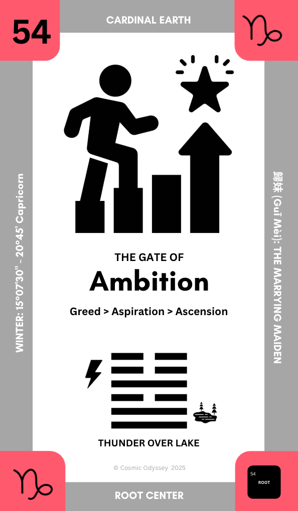 This is the gate often associated with ambition, but in its deeper sense, it speaks to aspiration, to the inner pull toward growth that feels purposeful rather than driven. In the Gene Keys, Gate 54 moves from the shadow of greed into the gift of aspiration and, at its highest expression, ascension. It reminds us that wanting more is not inherently wrong, but that our longing needs orientation in order to become nourishing.