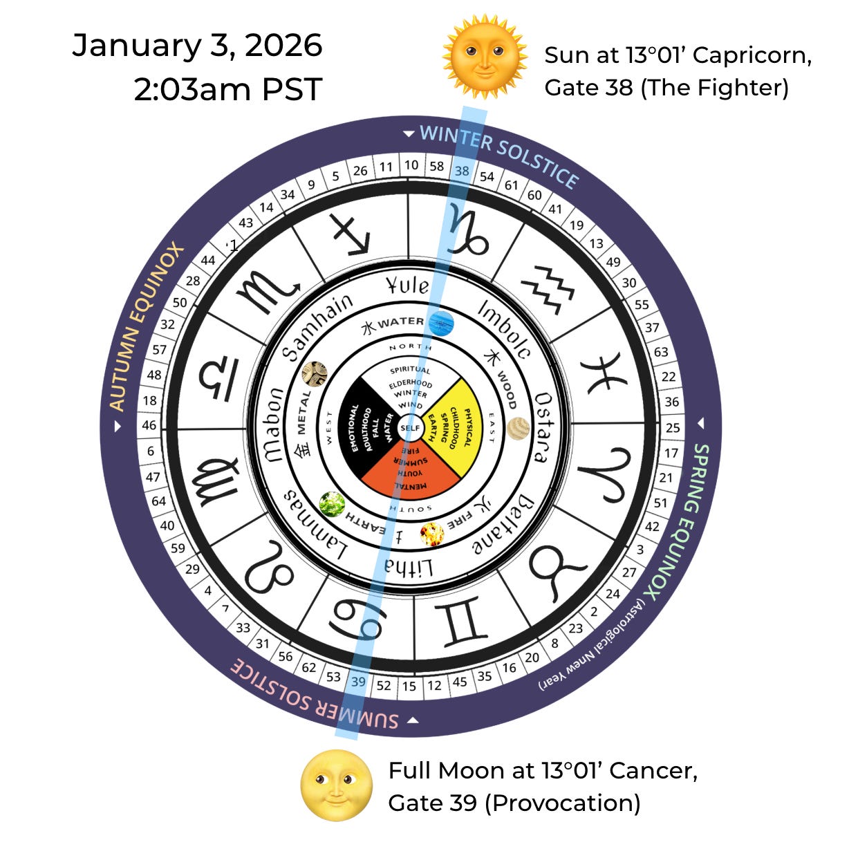 This moon is happening in a specific part of the sign of Cancer. In Human Design, the Zodiac correlates with the 64 hexagrams of the Ancient I’Ching, known as the 64 gates. This full moon in Cancer falls in Human Design Gate 39, known as the Gate of Provocation, evoking the image of a crab coming out of hiding and coming at you with it’s monster claw.