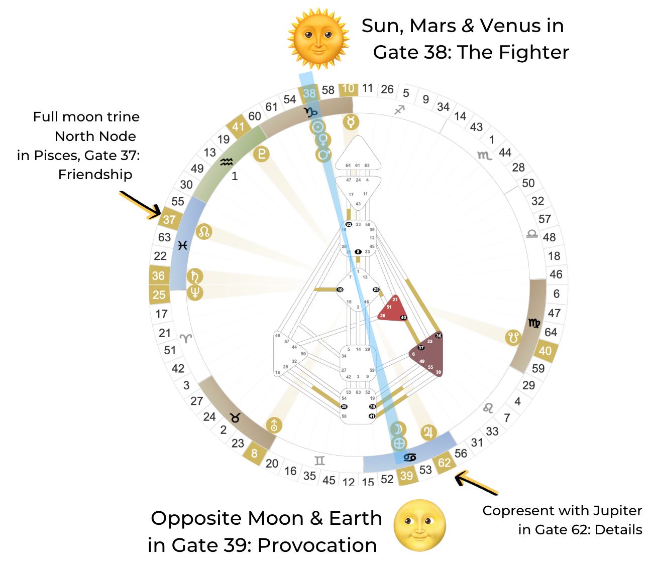 Across the sky, this Cancer Moon is in opposition to a powerful grouping of planets in Capricorn. The Sun, Mars, and Venus are all here together, moving through Gate 38, known as the Gate of the Fighter.