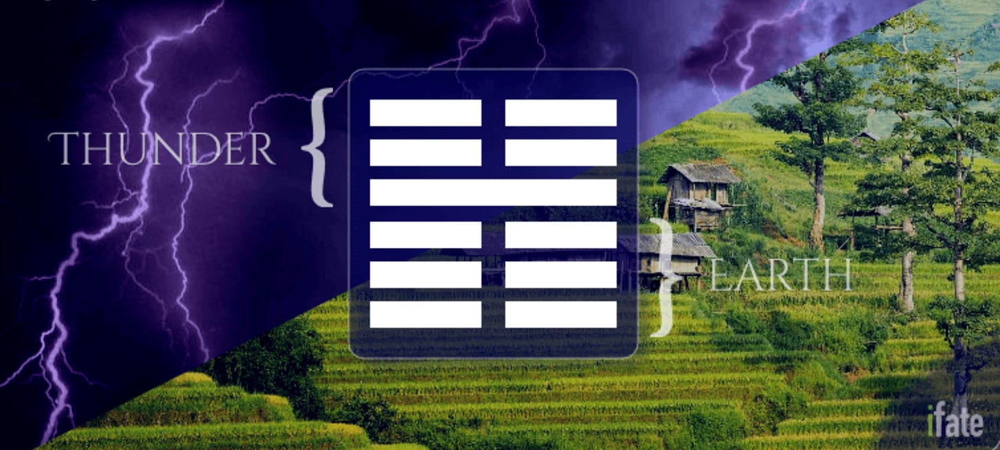 The one solid line in the hexagram is like a thunder bolt of creative energy that sparks and inspires the more receptive nature of the earth. The enthusiasm contained in this thunder can be described like a singer or dancer who is so passionate about their art that they inspire a crowd of people to rise to their feet, which in turn inspires the singer or dancer to perform their very best.