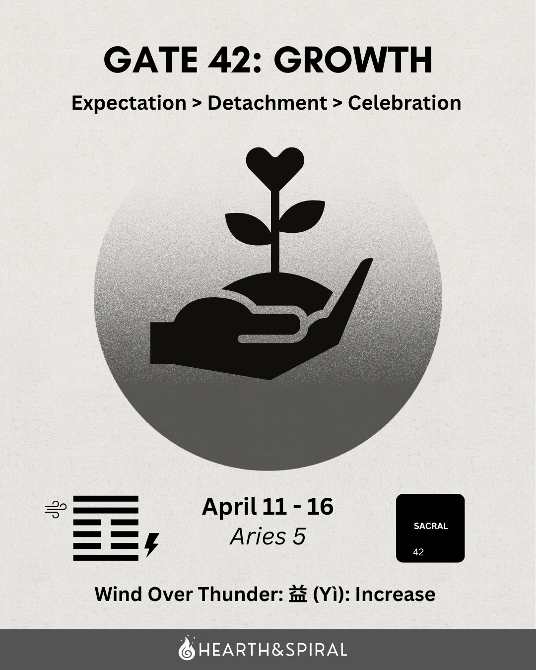 Gate 42 lives in the Sacral Center as well, and it forms the Channel of Maturation with Gate 53 in the Root Center. Together they carry the full picture: 53 is about starting, 42 is about finishing. The hexagram is Wind over Thunder, and the I Ching knows it as Increase. It’s the sense that when a cycle completes with full presence and willingness, something new always grows from it.