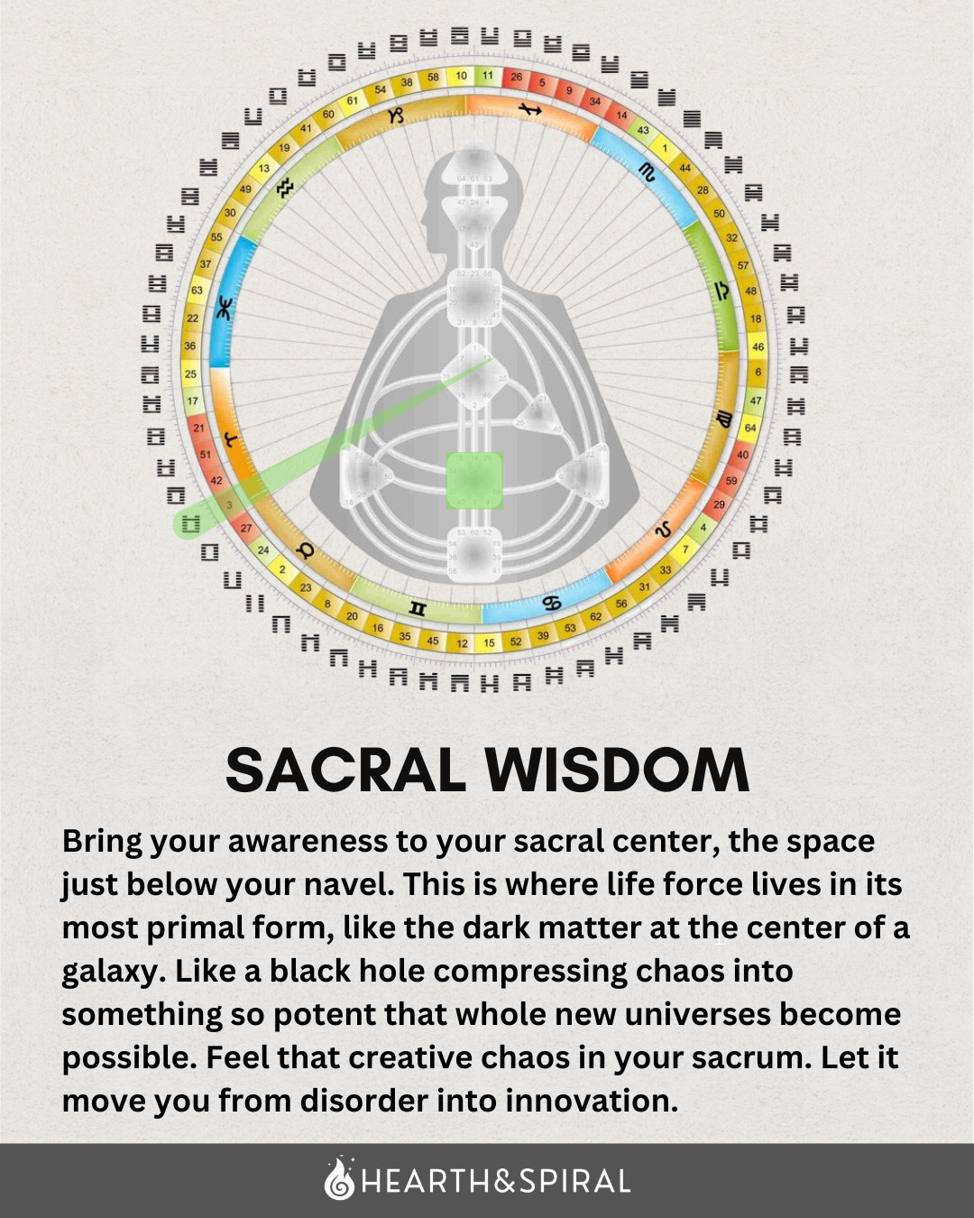 Gate 3 lives in the Sacral Center, the body’s primary motor, located in the lower abdomen roughly between the navel and the pubic bone. This is the visceral, generative hum of life force itself: the energy that fuels sustained work, reproduction, sexuality, and response.