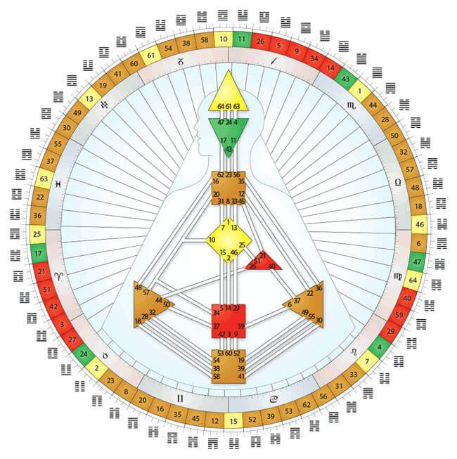In the late 1980s a man named Ra Uru Hu received what he described as a mystical transmission and developed Human Design, a synthesis that took the 64 hexagrams of the I Ching and mapped them directly onto the zodiac wheel, as well as onto the chakra centers of the body. The mandala arranges all 64 gates in the Fuxi sequence around the full 360 degrees of the Zodiac.